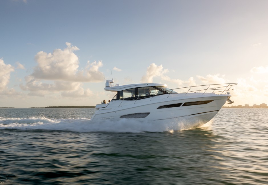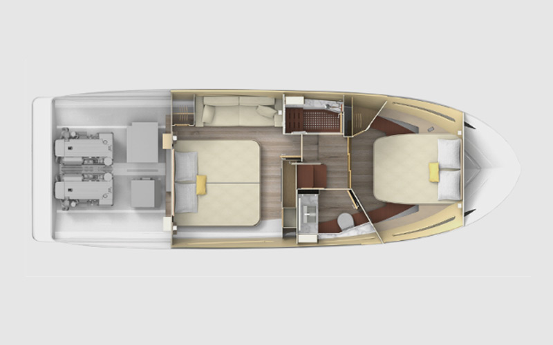 The 38 Grande Coupe was designed for clear views and natural light from the cabin to the upper salon. Thanks to large single-pane windows, the upper salon features 360° views, and with hull side windows, your cabin will be flowing with natural light.