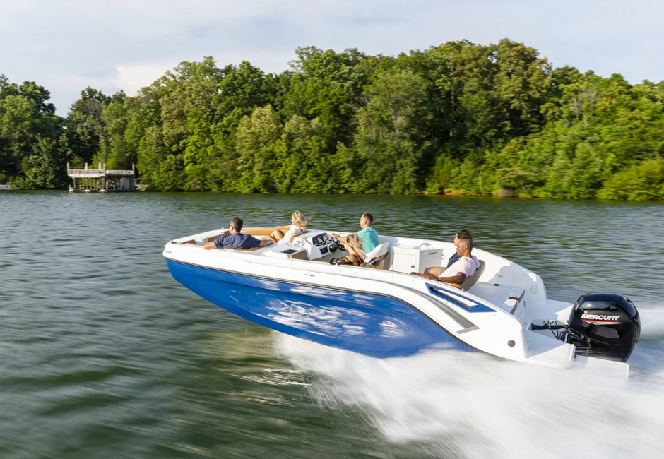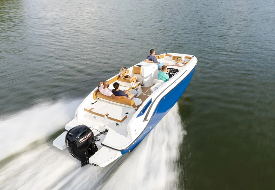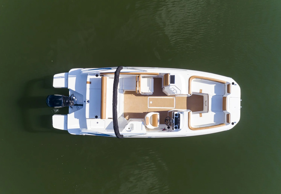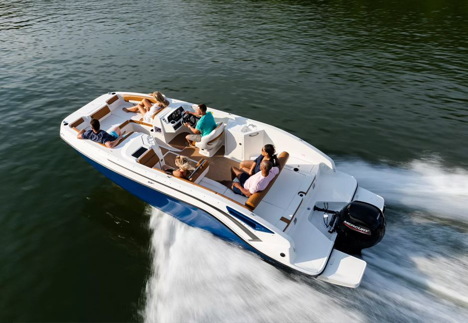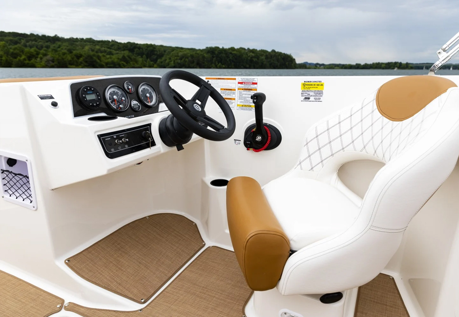 This family-friendly outboard model combines all the most popular aspects of the DX Series. The sleek exterior is complete with hull sculpting and stylish shear lines while the interior is loaded with all the comforts of home. The plush upholstery features quilting with black welt plus transitional cockpit and transom seating offer total lounging comfort while facing forward or aft. When underway the wider V-hull offers stability and a high freeboard keeps everyone safe and dry.