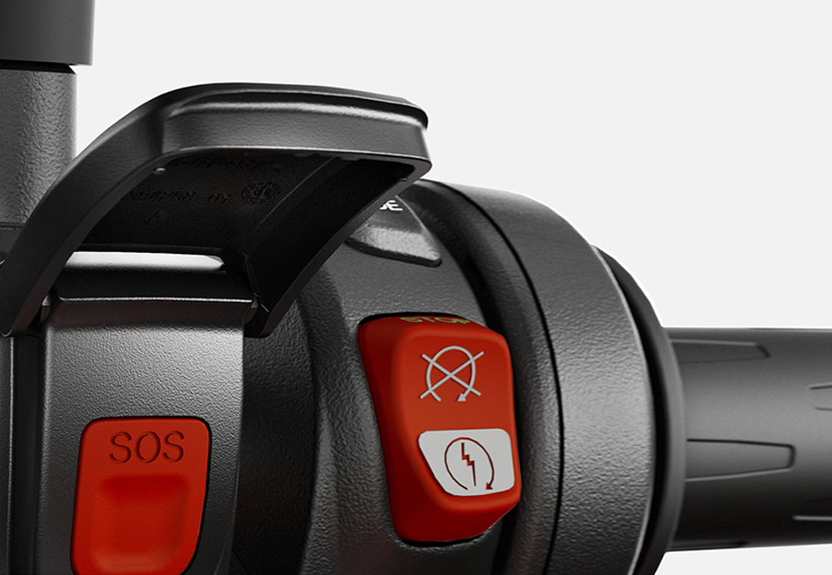 The hand brake lever guards make a clear statement in terms of uncompromising sportiness. The curved bracket made of aluminium and plastic protects the brake and clutch lever on the handlebar from being inadvertently activated when touched by another vehicle and the vehicle from being damaged in an accident.