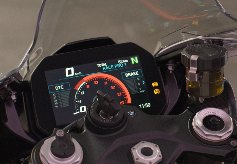 Off to the pit lane after a few laps around the racetrack: The last screen used is always displayed after you switch the ignition off/on. This helps you concentrate and stay focused on your mode. One Pure Ride screen and three different Core screens are available depending on your preference. The system displays a suitable maximum speed when the engine is cold. The shift light now clearly indicates when the rotational-speed sensor is flashing. Thanks to the clear TFT display, you can quickly view all other settings as well.