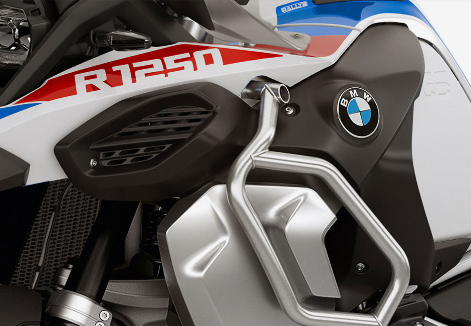 The Style Rallye underlines the sporty potential of the dual-sport enduro. The colour combination Light white, Racing blue metallic and Racing red, together with the optional black or gold cross-spoked wheels and the low three-colour rally seat, provide a real rally feeling.