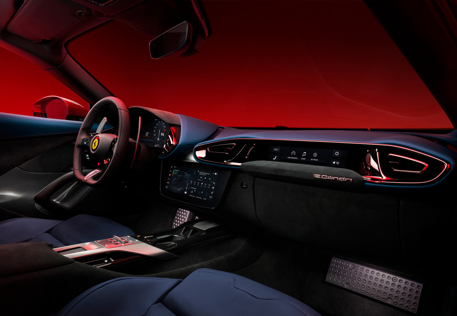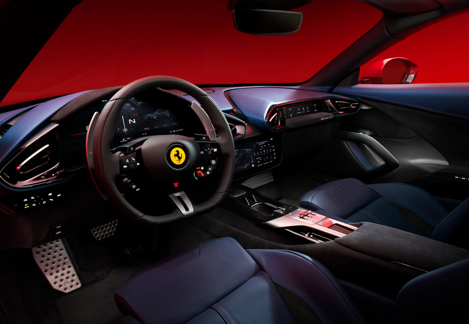 The interior style takes its inspiration from the Prancing Horse’s dual-cockpit architecture. The 12Cilindri’s cabin has an almost-symmetrical structure comprising two modules for driver and passenger and offering an astonishing standard of comfort and involvement in the driving experience. It introduces a new Human Machine Interface (HMI) comprising three displays that raise the Ferrari V12 berlinetta onboard experience to new heights. All of the main functions can be controlled from the central 10.25” touchscreen capacitive display within reach of both driver and passenger. This is flanked by a 15.6” driver display showing all of the driving and vehicle dynamics information. Lastly, the passenger is always completely involved in the driving experience thanks to an 8.8” display.