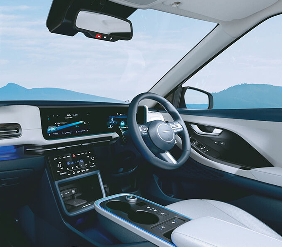 Step inside Hyundai CRETA Electric and get transported to a world of calm. The dual tone navy and gray interior complements your lifestyle. The dual curvilinear screens 26.03 cm (10.25")(HD infotainment and digital cluster) ensure everything you need is right in front of you. The three-spoke EV unique steering wheel with morse code “H” for Hyundai, the floating console and the trendy horizontal AC vents with soothing ocean blue ambient light masterfully blends technology and style.