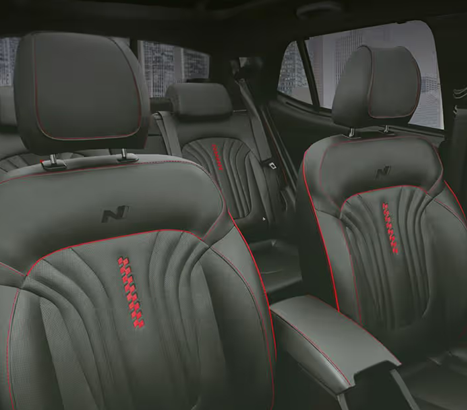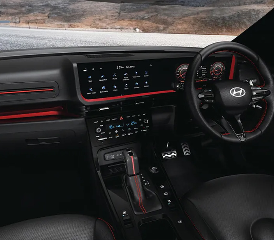 Step inside the cockpit of the Hyundai CRETA N Line and lose yourself in the fusion of performance and precision. The exclusive sporty black interiors with athletic red inserts courses through every angle inside. Feel the command centre at your fingertips, the steering wheel, gear knob and seats sporting the iconic N logo. With red ambient lighting, a seamlessly integrated curvilinear infotainment and cluster screen, as well as crafted leather* seats with the N logo, it’s designed to amplify your drive and turn every journey into an exhilarating conquest.