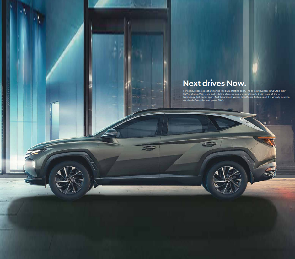 Hyundai TUCSON Car Exteriors: Next Drives Now. For some, success is not a finishing line but a starting point. The all-new Hyundai TUCSON is their SUV of choice. With looks that redefine elegance and are complimented with state-of-the-art technology that stands apart. Add the unique Hyundai SmartSense features and it is virtually intuition on wheels. Truly, the next gen of SUVs.