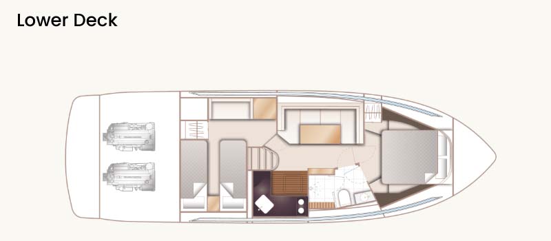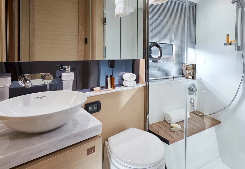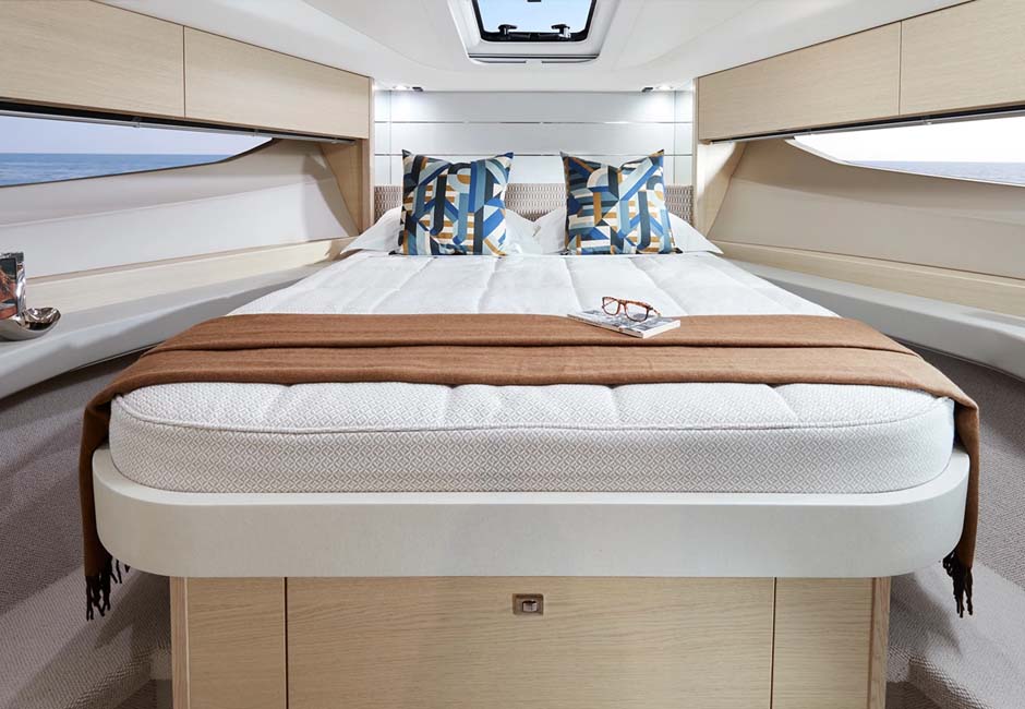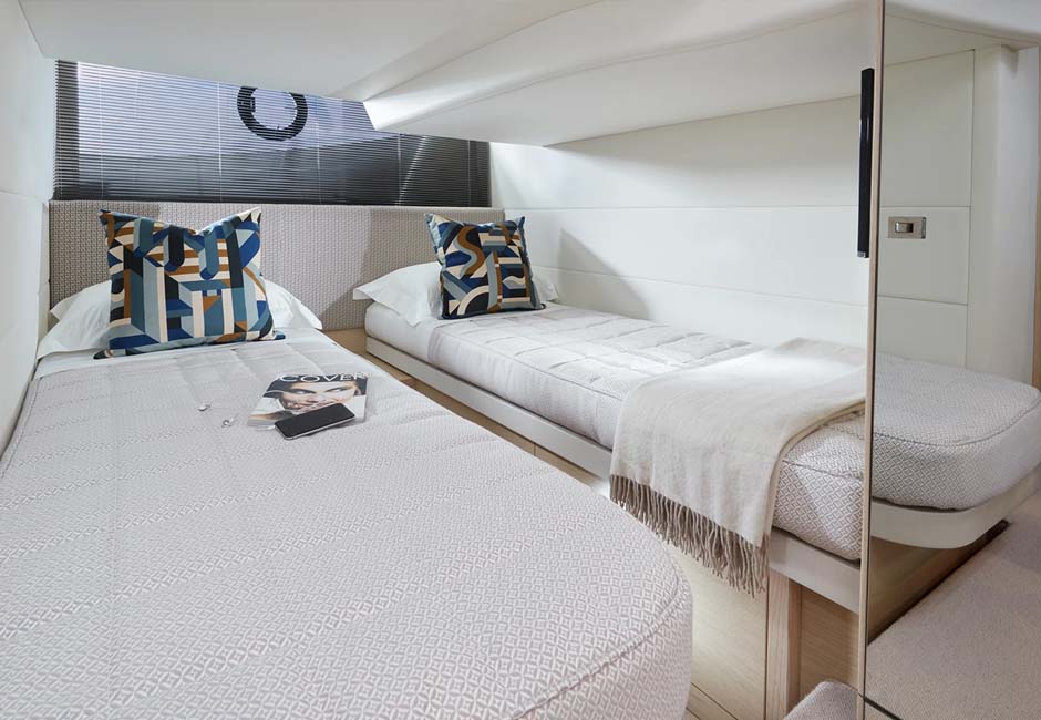 The forward cabin has an en-suite bathroom with secondary access to the saloon, while the aft cabin can be fitted with optional sliding berths to provide easy conversion to a double bed when required.