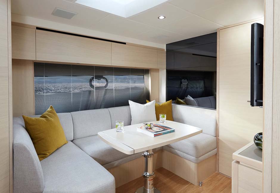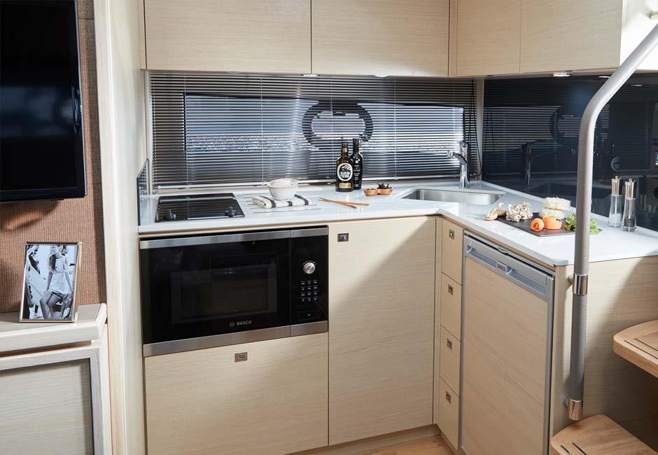 The interior design of the V40 displays the modern V Class look throughout. Below deck, the spacious saloon and well-equipped galley combine to create a highly sociable entertaining space.