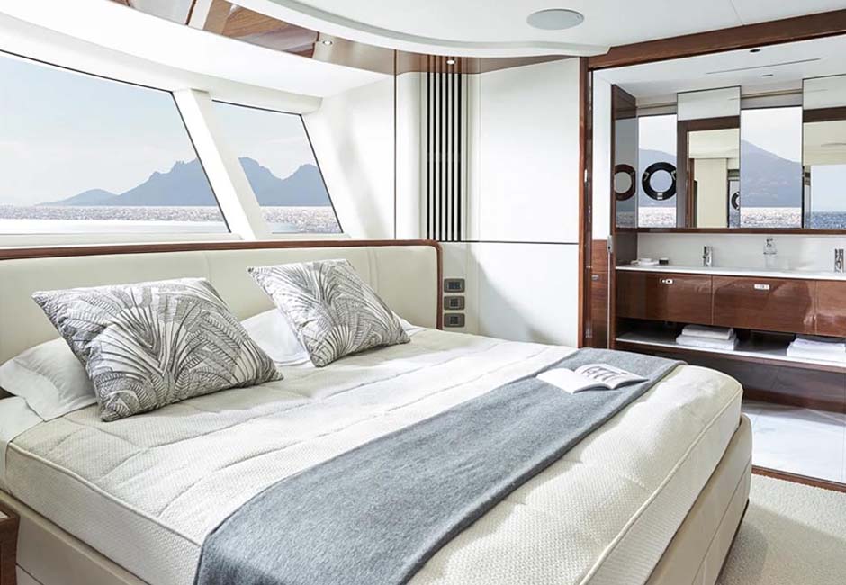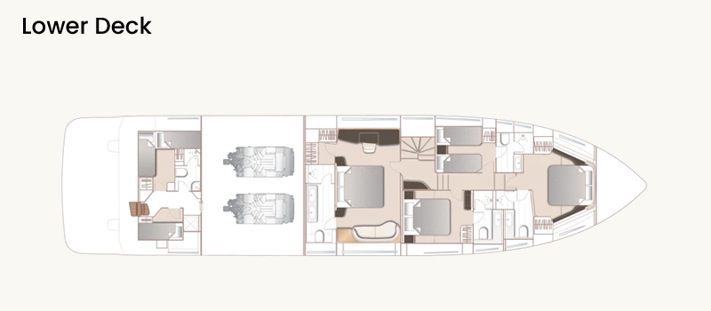 The use of light and innovative design continues below deck, where eight guests can be accommodated across four en-suite cabins: a full beam master stateroom located amidships, a forward guest stateroom, a double guest to starboard and a twin cabin to port. The crew quarters, located aft of the main accommodation, can accommodate three crew with the standard layout.