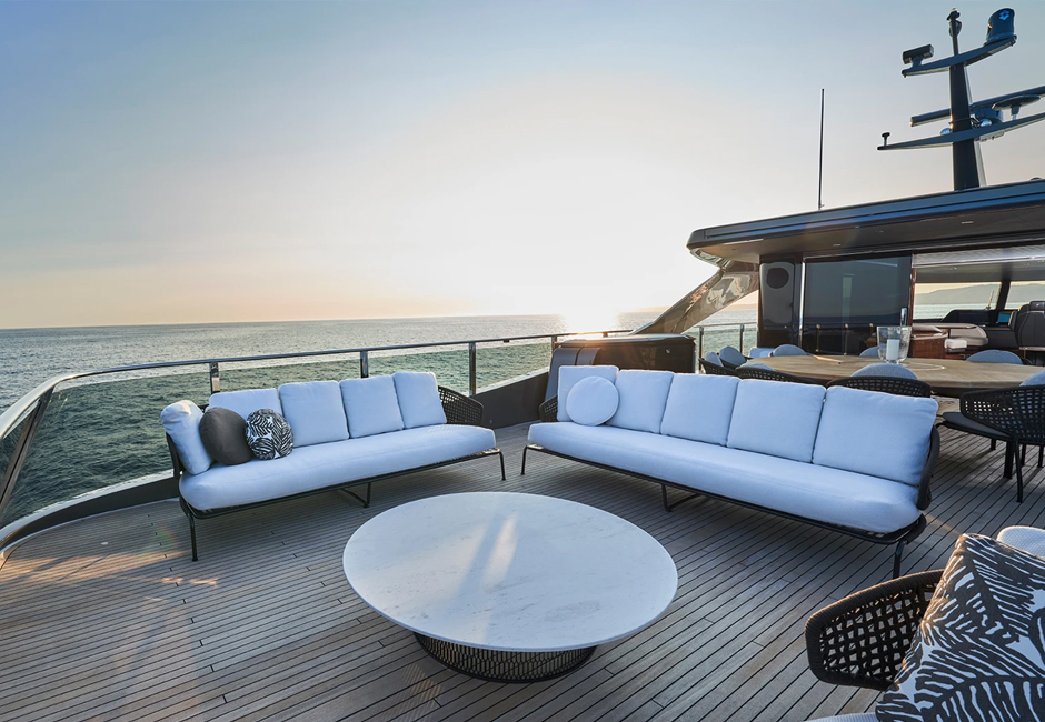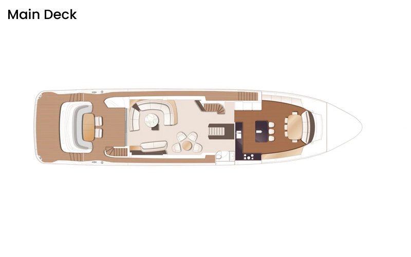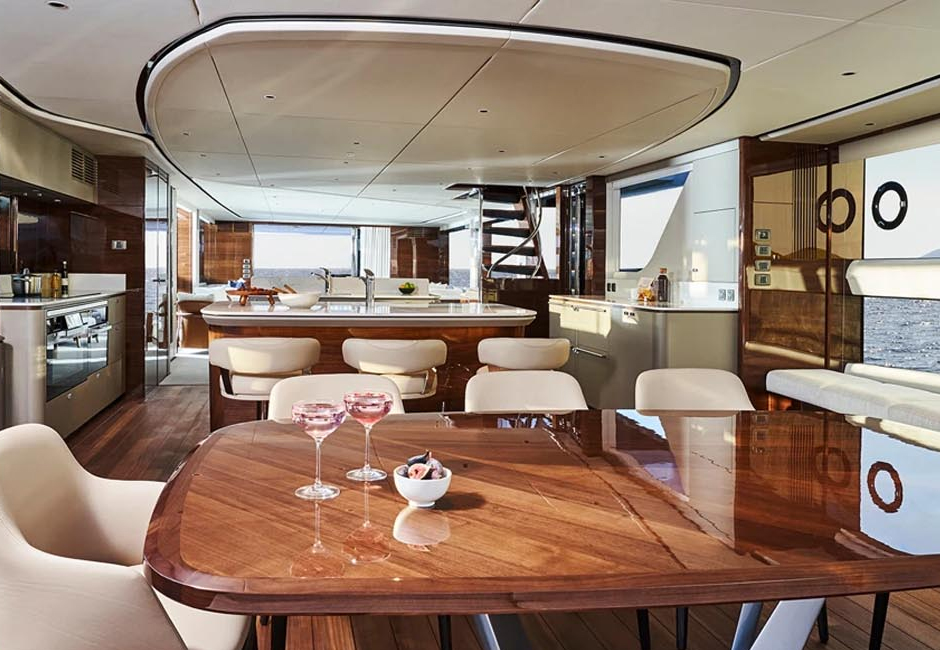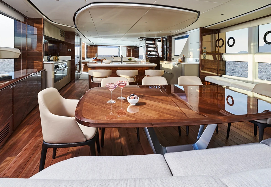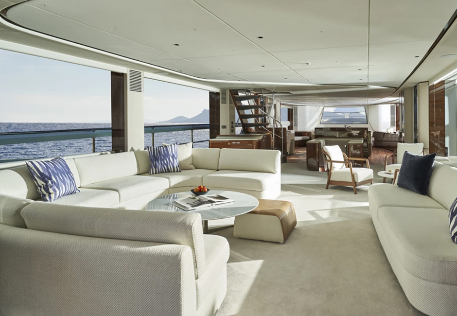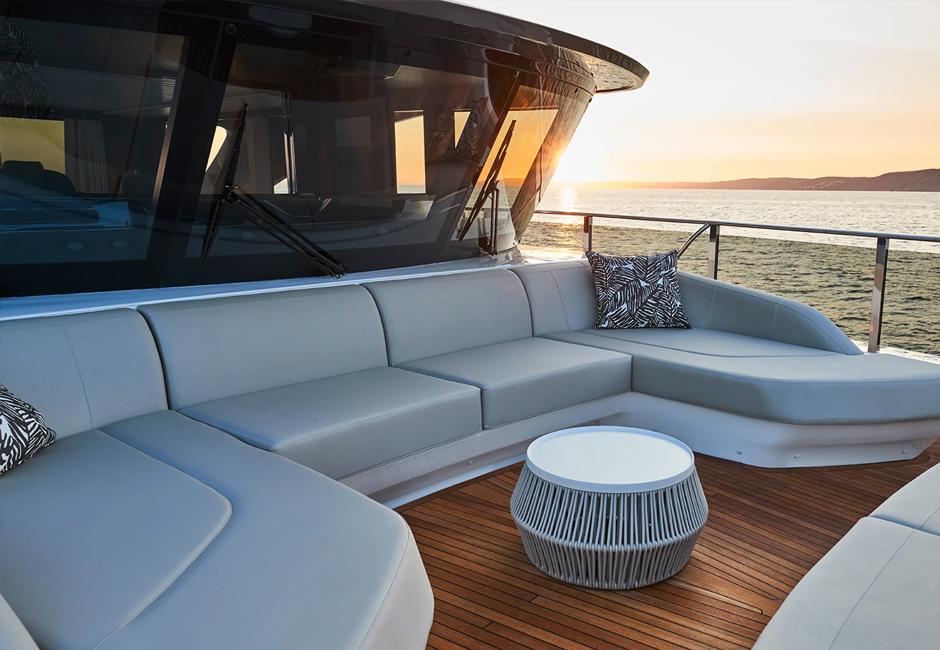 Experience superyacht space as you enter the main deck saloon, with a line of sight through the forward window and, thanks to the new open bow design, to the expansive views beyond. Ascend the internal staircase to the upper deck, and another unique experience awaits: the fully enclosed and climate-controlled sky lounge.