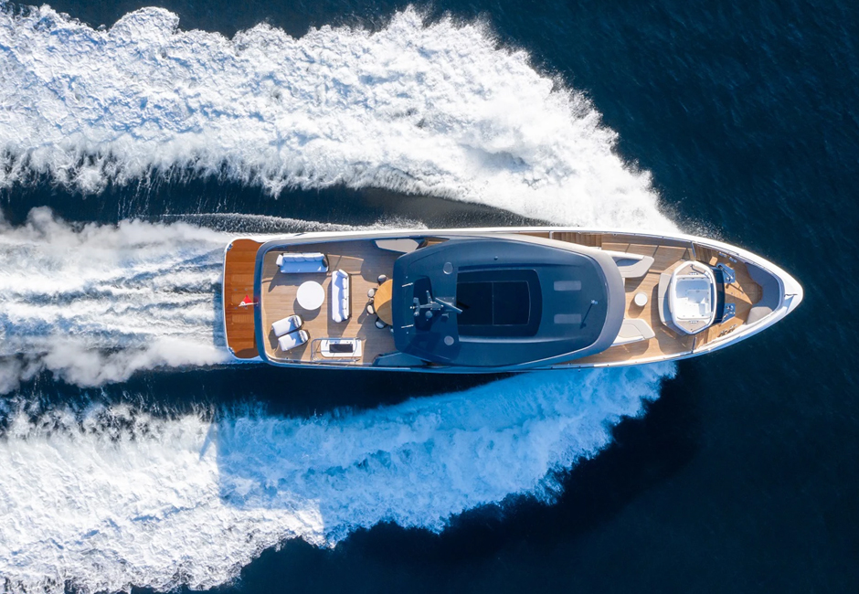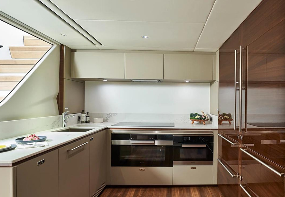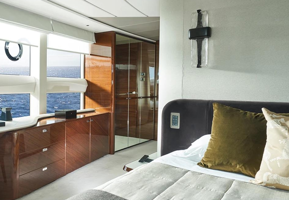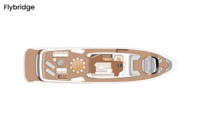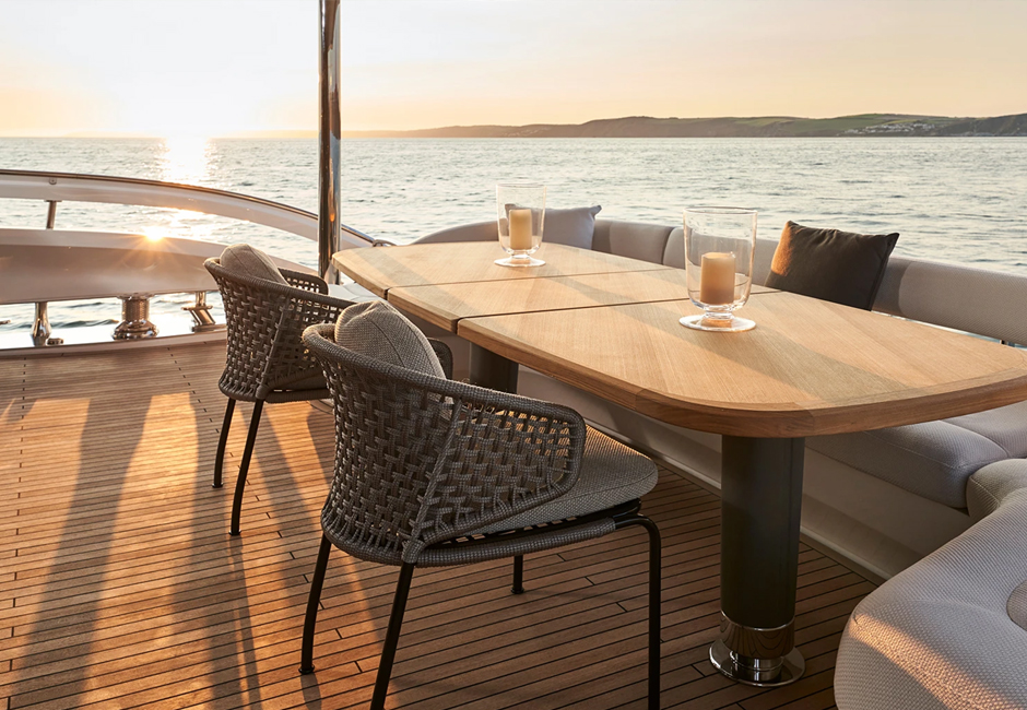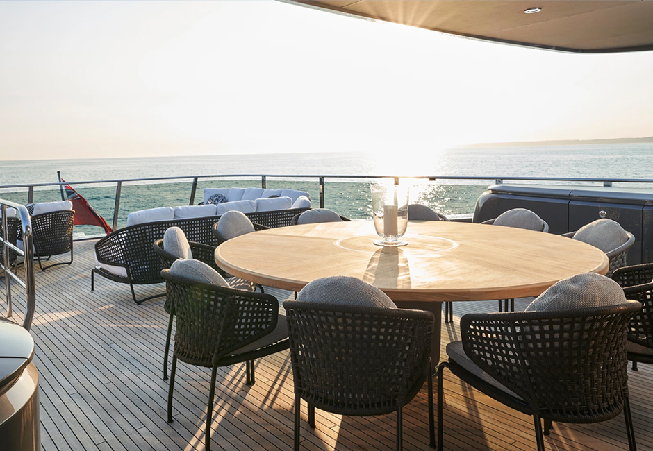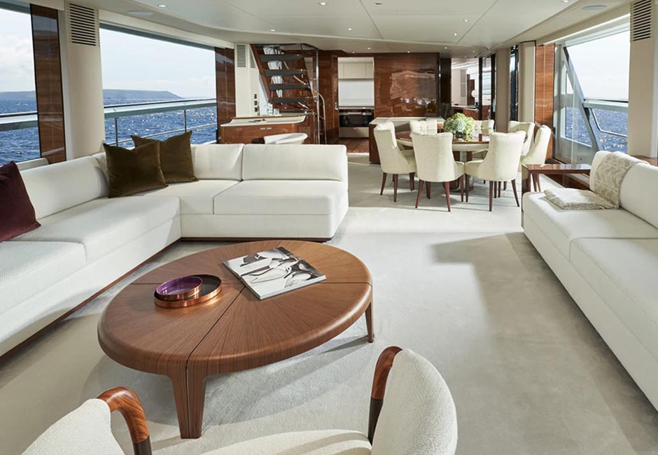 Experience superyacht space as you enter the main deck saloon, with a line of sight through the forward window and, thanks to the new open bow design, to the expansive views beyond. Ascend the internal staircase to the upper deck, and another unique experience awaits: the fully enclosed and climate-controlled sky lounge.