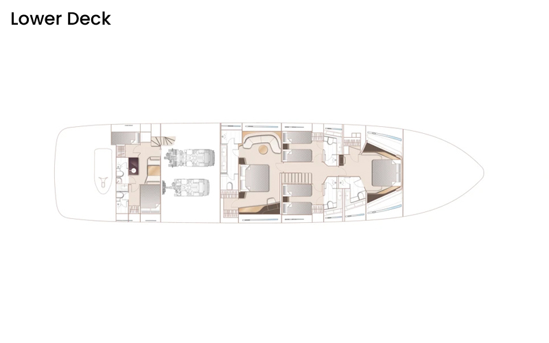 Taking pride of place on the lower deck is the full beam master stateroom with en-suite bathroom, complemented by the forward stateroom with walk-in wardrobe and en-suite. Additional port and starboard guest cabins can each be configured with two single beds or an electrically converting double bed, while generous crew quarters complete the extensive accommodation.