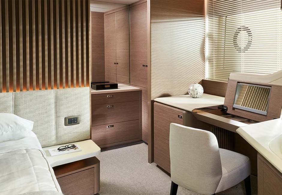The full-beam owner’s stateroom has a particularly refined feel, thanks to architecturally inspired feature panels, fresh linen wallcoverings, a bronze tint mirror and a vanity desk wrapped in Livorno Stone leather. It has its own dedicated staircase leading up to the main deck via a private lobby area connected to the saloon.