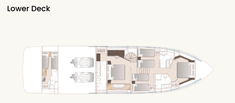 Forward on the lower deck, six guests can enjoy three beautifully appointed guest cabins, while an additional en-suite cabin with two single beds is positioned aft for crew or occasional guests.
