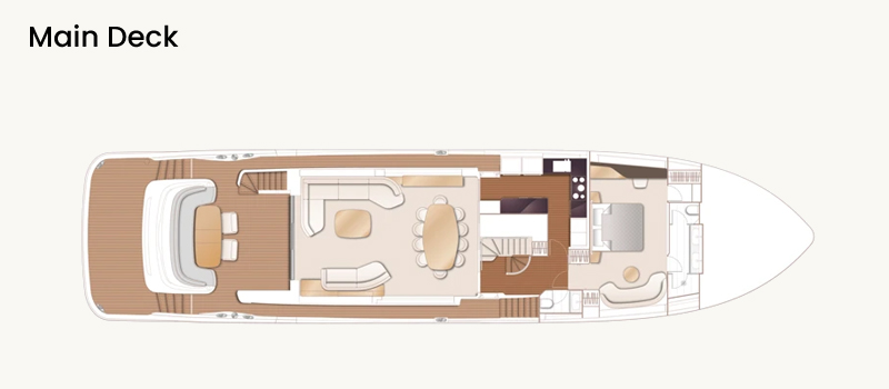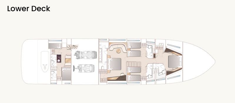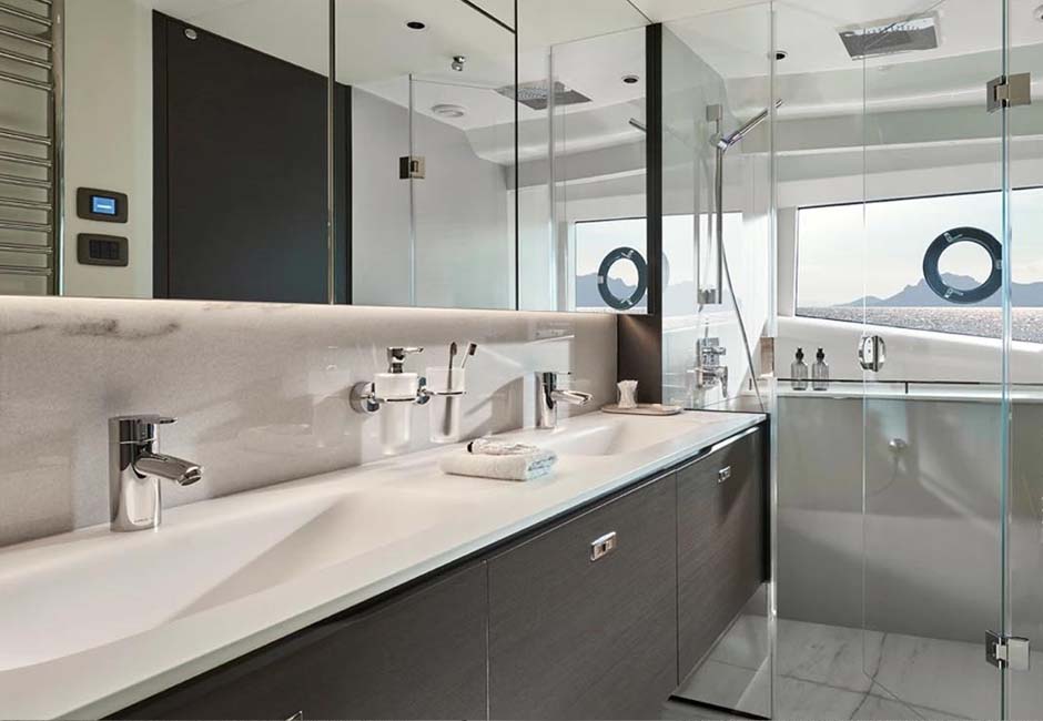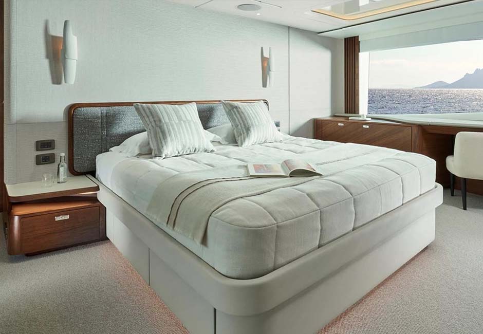 With an interior volume comparable to larger yachts, the main deck of the Y95 features a full beam master stateroom with skylights. This is complemented by a further four well-appointed en-suite guest cabins, along with generous crew accommodation including an en-suite Captain’s cabin with double bed.