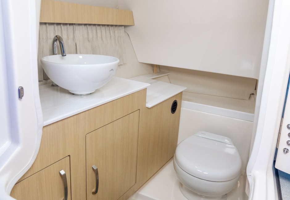 Tucked behind a hand-wrapped console, a spacious and well-appointed head makes you feel at home.