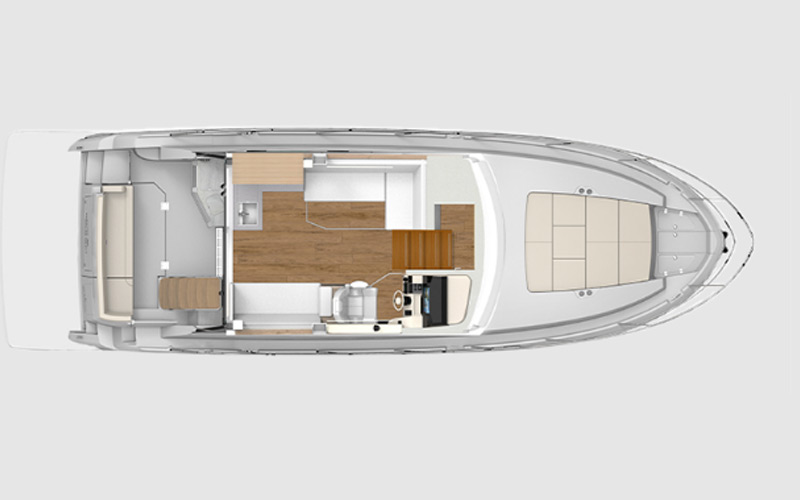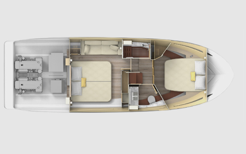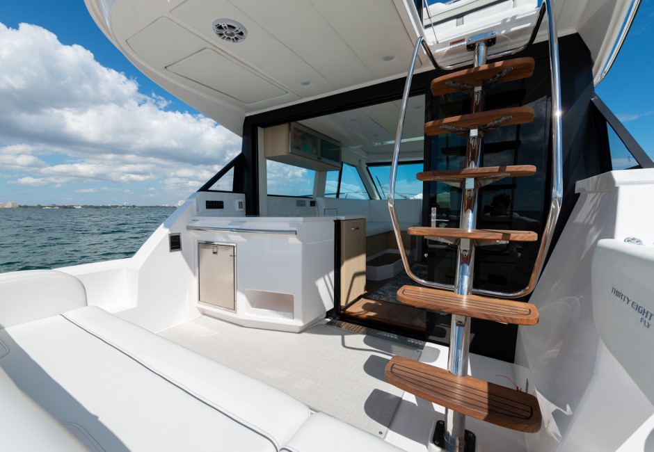 The 38 Fly features the most spacious forward stateroom in its class thanks to the centerline California Queen and walk-around space.
