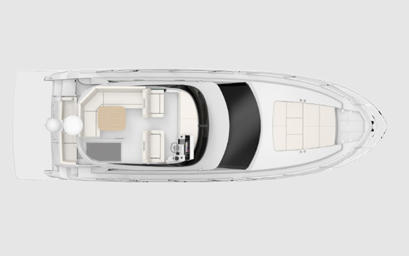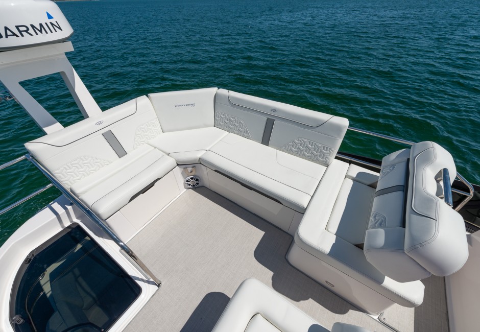 Lay back and enjoy the sunshine or sit up and watch the water on the mulitposition foredeck sunpad. The optional cabana is perfect if you love the view but want some shade.