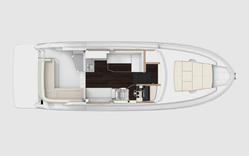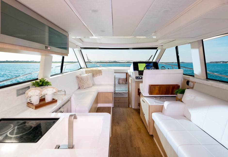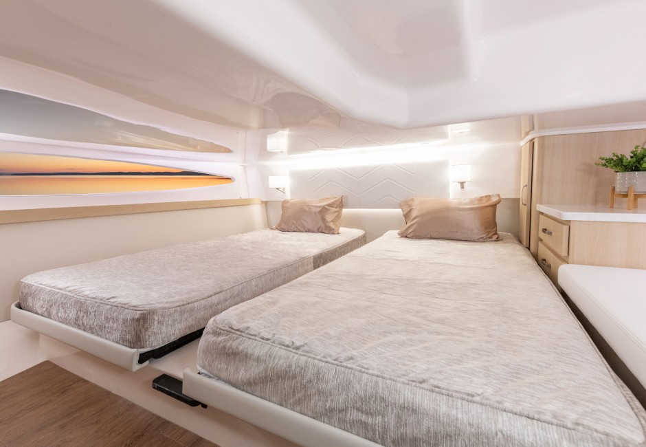 The 38 Grande Coupe was designed for clear views and natural light from the cabin to the upper salon. Thanks to large single-pane windows, the upper salon features 360° views, and with hull side windows, your cabin will be flowing with natural light.