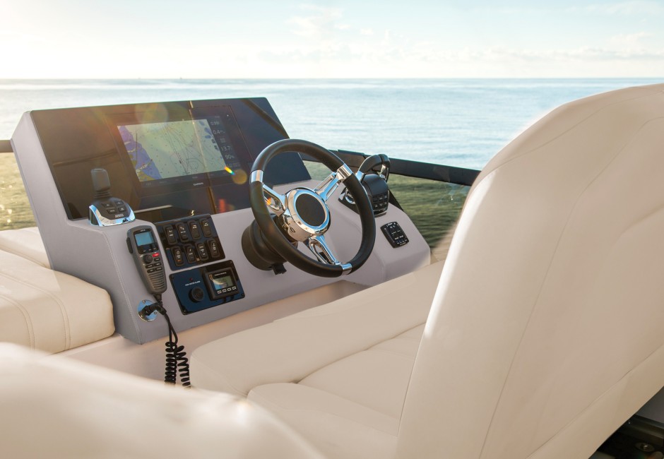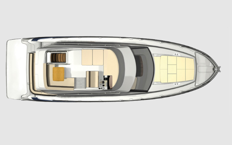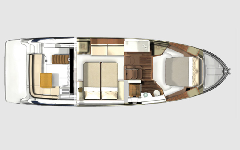 The 42 FLY features the most spacious forward stateroom in its class thanks to the centerline California Queen and walk-around space.