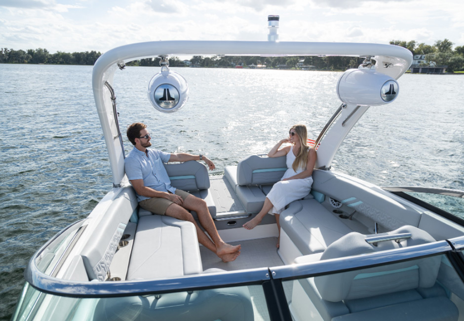 Enjoy the convenience of dual multi-position UltraLounges, a low-to-the-water swim platform, and two fold-away rumble seats, creating the perfect setting for relaxation, socializing, and water activities.