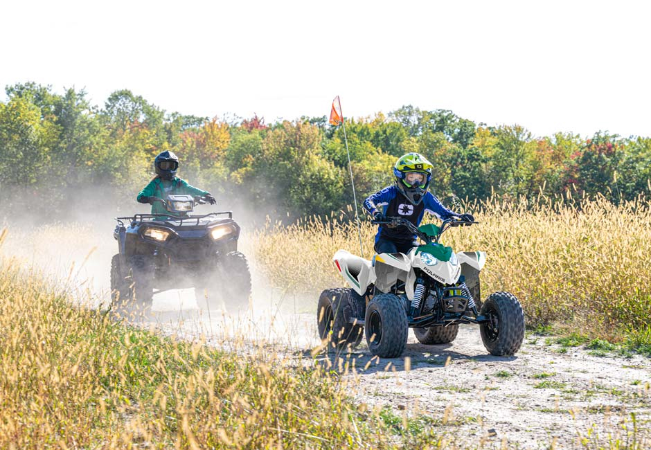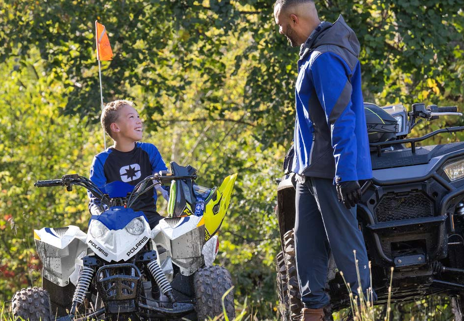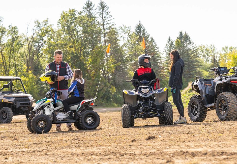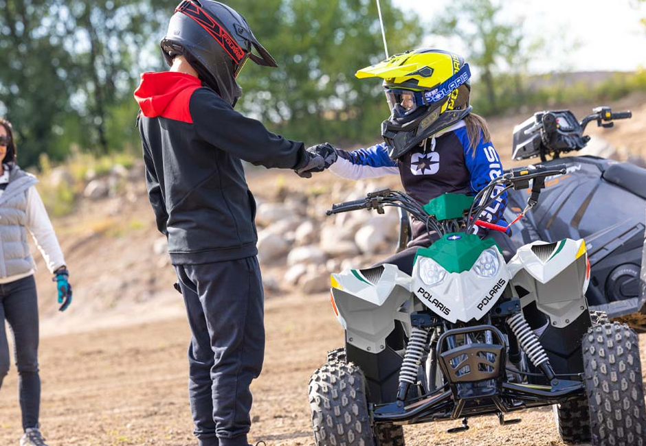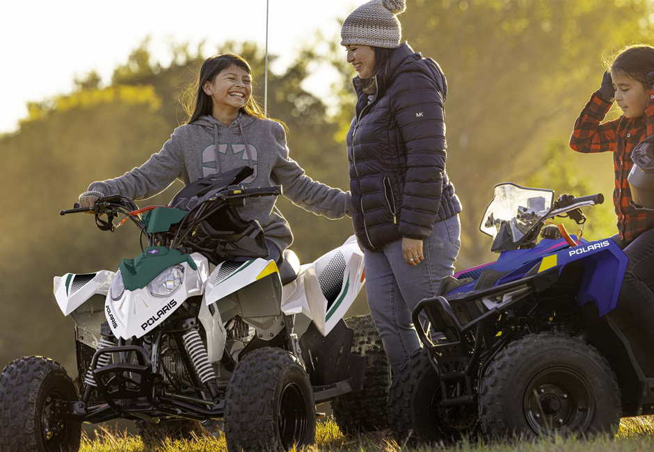 A youth ATV perfect for introducing young riders to trail riding. Engineered for safety, control and fun. Ages 10+ with adult supervision. Enjoy peace of mind knowing this vehicle comes with leading safety features including an adjustable speed limiter, drum brakes, industry-exclusive safety kit and LED lights.