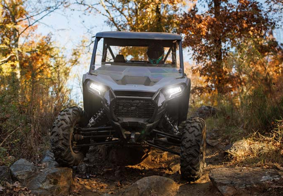 Fearlessly take on harsh terrain wth a more fortified ride. A patent-pending, full-coverage skid plate enhances powertrain protection, while a tubular front bumper helps shield the front of the machine from trail elements.